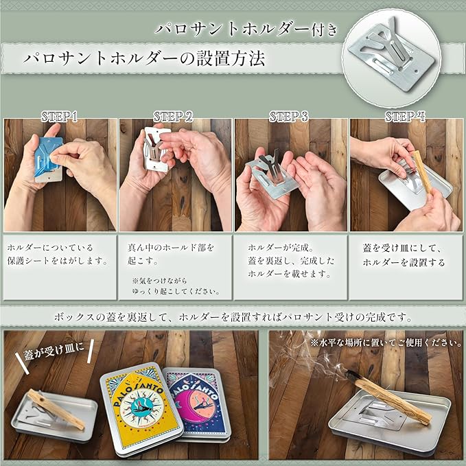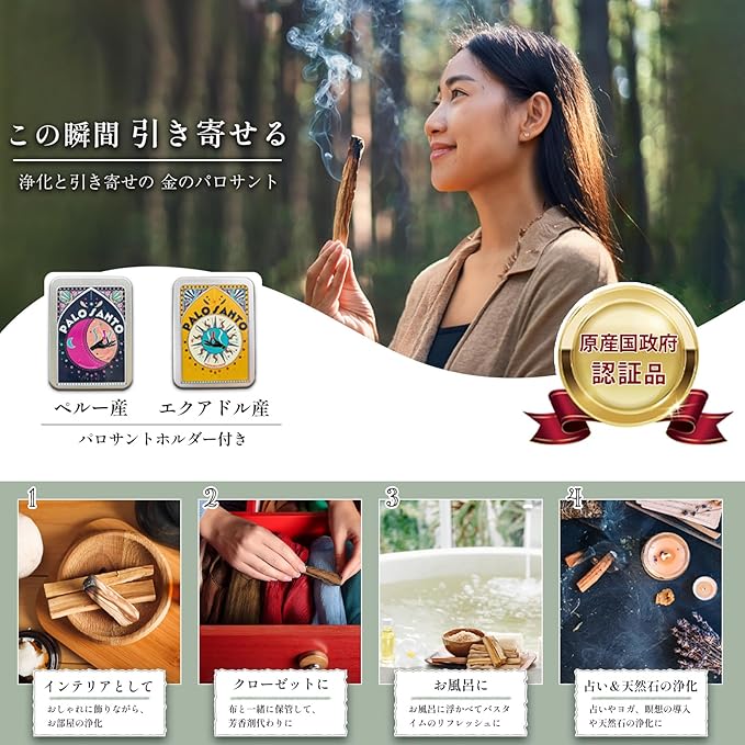 使用方法: パロサントの香木に火をつけ、炎が落ち着いたら、ゆっくりと煙が立ち上るのを見つめながら、深呼吸をしてリラックスしてください。お部屋やオフィス、瞑想の空間で使用することで、自然なエネルギーが循環し、あなたの願いを引き寄せる準備が整います。 ※詳しいご使用方法は、説明書が商品に添付されておりますので、そちらをご確認ください。
