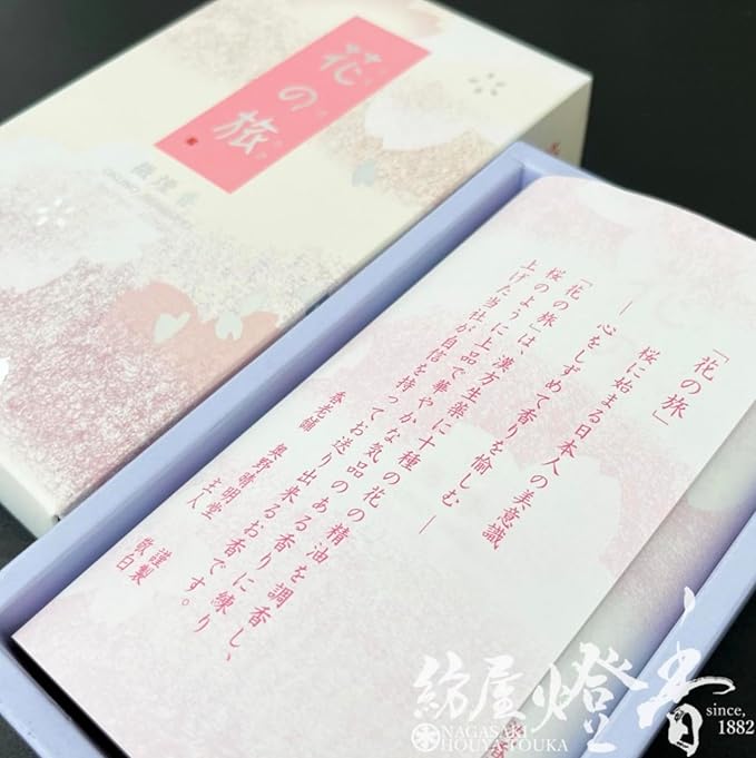 十種の花の精油を調香し、桜のように上品で華やかな気品のある香りです。微煙タイプ、線香の色:茶、 パッケージサイズ:約166 97 40mm