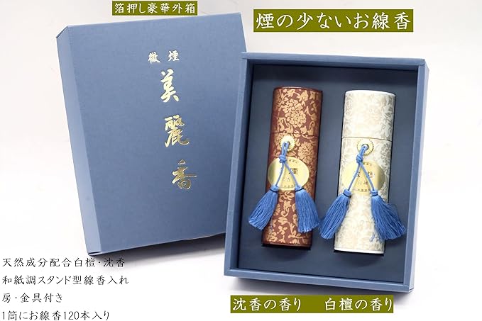 【美麗香二種香 御仏前熨斗】お線香セット 煙の少ない微煙タイプ 白檀・沈香の香り 包装・御仏前入り熨斗付き お盆・喪中・喪中御見舞・ギフト・進物・贈り物・贈答用線香【安心の国産線香 made in japan】 【創業文政三年永楽屋】