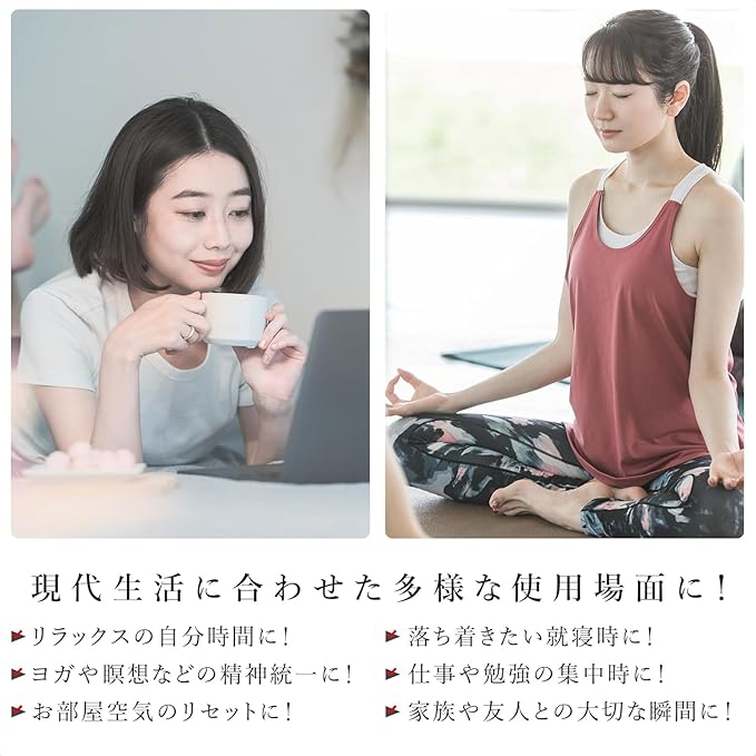 【おすすめ用途】リラックス / 空気リセット / 就寝時 / 勉強時 / 集中時 / デスクワーク / ヨガ / アロマセラピー / 生活臭防止