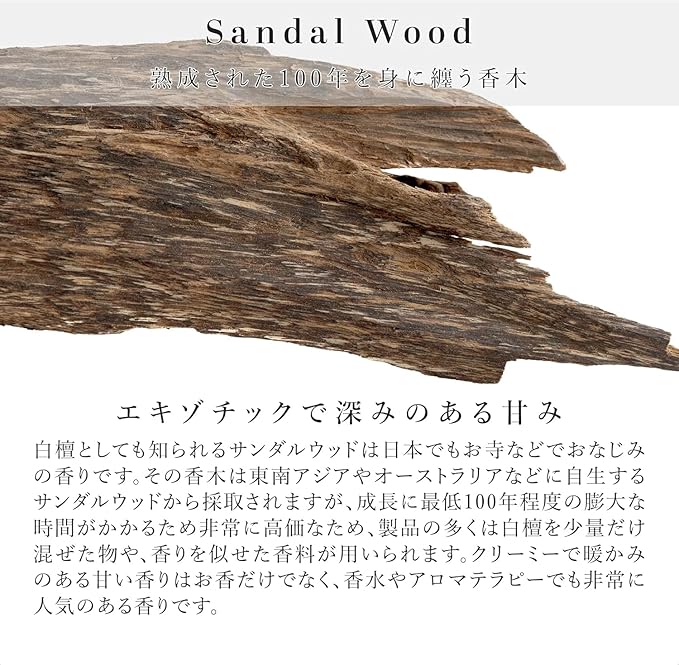 【お香の香り】白檀としても知られるサンダルウッドは日本でもお寺などでおなじみの香りです。その香木は東南アジアやオーストラリアなどに自生するサンダルウッドから採取されますが、成長に最低100年程度の膨大な時間がかかるため非常に高価なため、製品の多くは白檀を少量だけ混ぜた物や、香りを似せた香料が用いられます。クリーミーで暖かみのある甘い香りはお香だけでなく、香水やアロマテラピーでも非常に人気のある香りです。