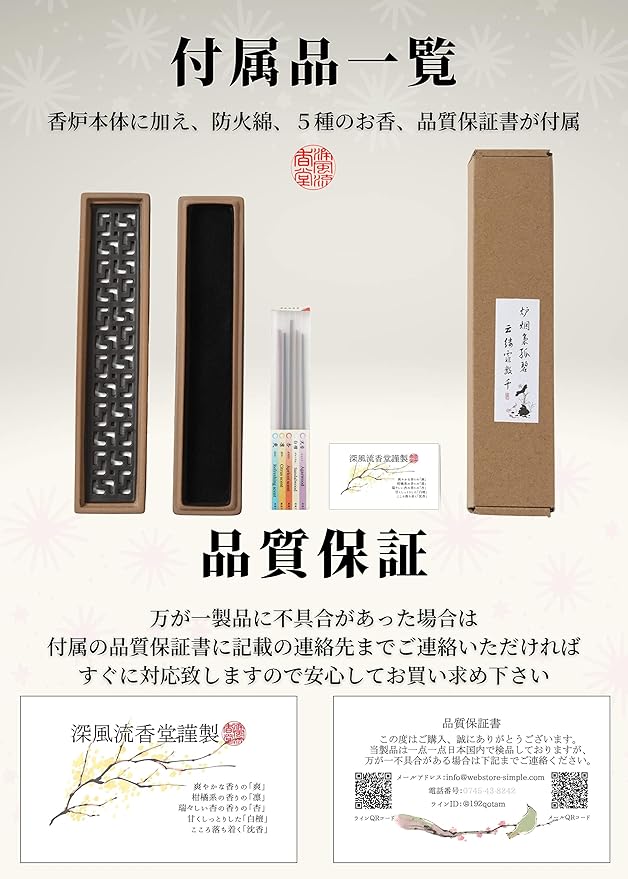 【経済的で保証も充実】お香・お線香を最後まで使い切れて経済的です。挿すタイプのお香立てやお線香立ては根元部分が残りがちですが、横置きタイプなのでお香やお線香を一本丸ごとお使いいただけます。また、品質保証カード付きで安心です。付属の深風流香堂謹製カードは日本国内で一点一点しっかり検品し合格した証ですので、安心してお買い求め下さい。万が一の不具合にも迅速に対応致します。