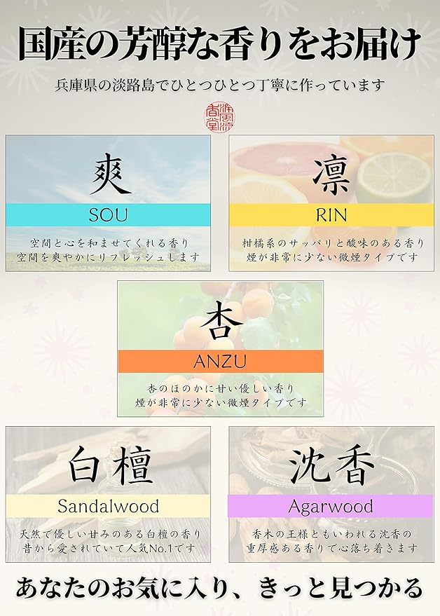 【これからお香をはじめる方に特にオススメ】爽やかな香りの「爽」、柑橘系の香り「凛」、瑞々しい杏の香りの「杏」、ほんのり甘くしっとりした「白檀」と落ち着く香りの「沈香」。この5種類の中にきっとお気に入りの香りが見つかるはずです。お香は全て兵庫県の淡路島で一本一本丁寧に作っています。