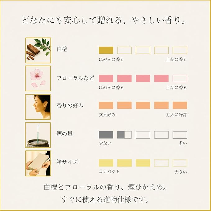 ■ 香りと品質の特長 ・創業450年の老舗による調香のハーモニー ・白檀とフローラル天然香料を調合したやさしい香り ・煙が少なく、お部屋の空気を汚しにくい設計