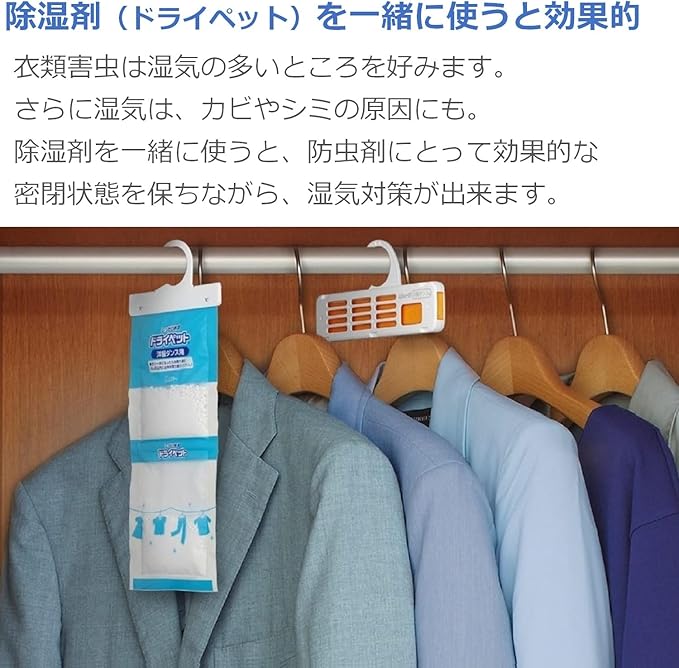 衣類害虫は湿気の多いところを好みます。さらに湿気は、カビやシミの原因にも。除湿剤を一緒に使うと、防虫剤にとって効果的な密閉状態を保ちながら湿気対策ができます。
