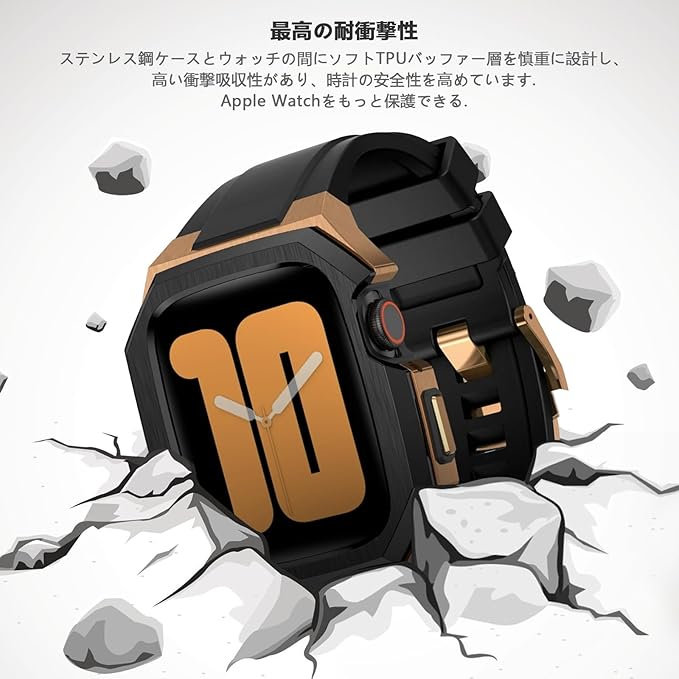【フルカバー保護設計】高品質なフッ素ゴム素材を使用した一体型デザインで、Watchを全面的に保護します。レイズドエッジデザインにより、高い耐衝撃性を誇り、落下や衝撃から時計をしっかり守ります。ステンレススチール製のケースは3色の選択肢があり、スタイリッシュで頑丈です。バンドとケースの重さは約152gです。