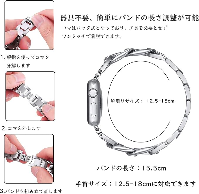 【対応機種】:このステンレス チェーンはApple Watch Ultra3,Ultra2,Ultra,Series 11/10/9/8/7/6/5/4/3/SE3/SE2 :49mm/46mm/45mm/44mm/42mm(series3の42mmです)に対応できます。バンド本体の長さは:15.5cmです、手首サイズ:12.5-18cmの方に対応できます。このバンドは304ステンレス素材で作られていますので、重さは76gで、重量感があります、購入前にぜひご注意ください。