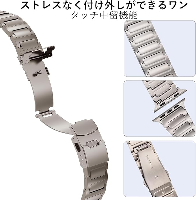 【なぜチタン製のApple Watchバンドを選ぶべきか?】チタン合金は航空材料であり、耐腐食性、アレルギー防止効果、耐熱性、耐寒性に優れています。ステンレス製のApple Watchバンドと比較して、チタン製のApple Watchバンドの最大の利点は驚くほどの軽さです。総重量は約60グラムで、着用感が非常に快適です。チタンは鋼よりも硬いため、チタン製のApple Watchバンドはキズにも耐久性があります。(素材について、バンドはチタン合金で、バックルはステンレス钢です。)