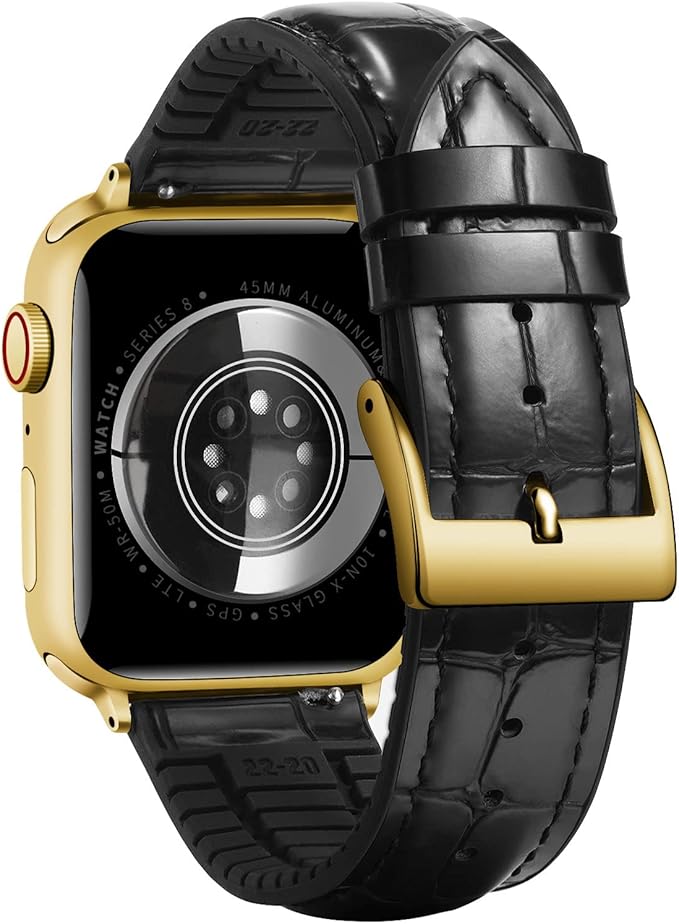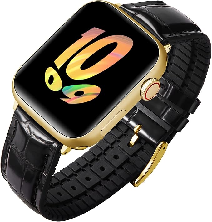 コンパチブル Apple Watch バンド 45mm 44mm 46mm 49mm 42mm コンパチブル アップルウォッチバンド レザーベルト ワニ革模様 内側シリコン製 通気性 コンパチブル iWatch バンド Ultra2 Ultra SE SE2 Series 10/9/8/7/6/5/4/3/2/1 メンズ レディース(ブラック,ゴールド バックル)