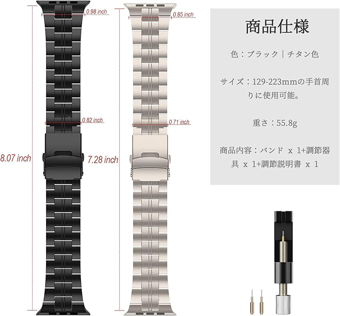 【簡単取付|調節器具付き】着脱も簡単です。毎日使うのは最適です。調節器具付き、簡単にバンドの長さの調整できます。調節tips:調節前に、バンドの穴と調節器具のピンをピッタリ合わせてください。強く押しすぎないでください。もし調節できませんの場合、時計屋や専門店へご依頼をおすずめです。