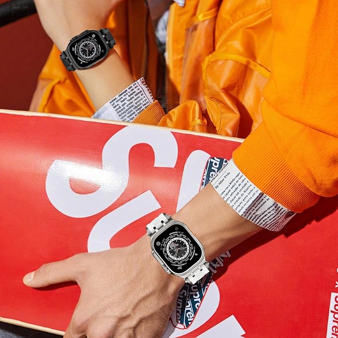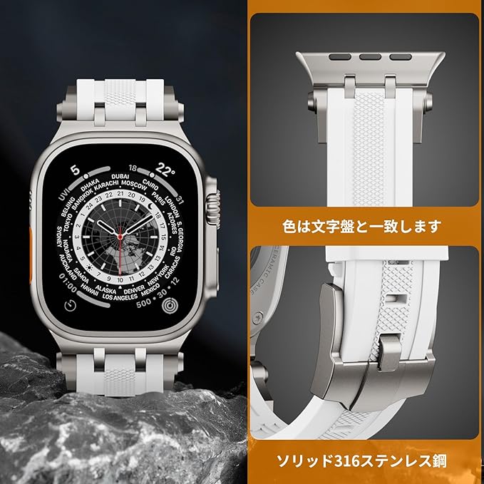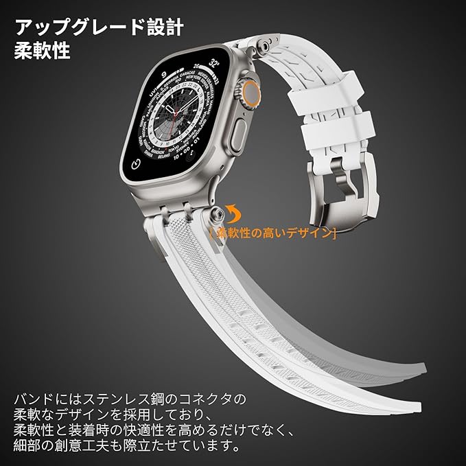【極限スポーツ風】屈強なバンド造形、男性向けの荒っぽいスタイルです。一体型バンドは、メタルコネクター、ソフトフッ素ゴム製で耐久性に優れています。Ultraに最適,カラーマッチしたメタルコネクタは、Apple Watch Ultraのチタン製ケースと調和します。
