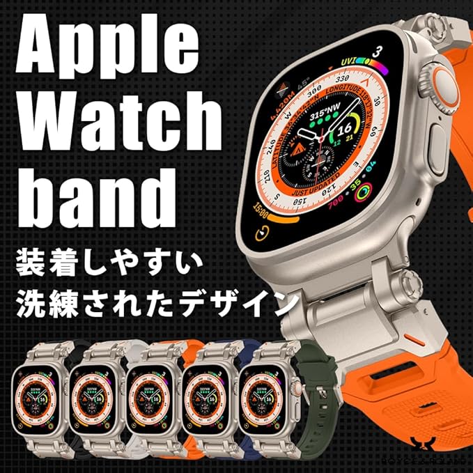 【耐久性抜群の設計】アップルウォッチUltraに完璧にマッチするタフで屈強なデザインです。メカニカルなコネクターにはステンレスを使用しており、耐久性の高い造りが特徴。アップルウォッチUltraのチタンケースに調和し、デザイン性も機能性も抜群のバンドです。
