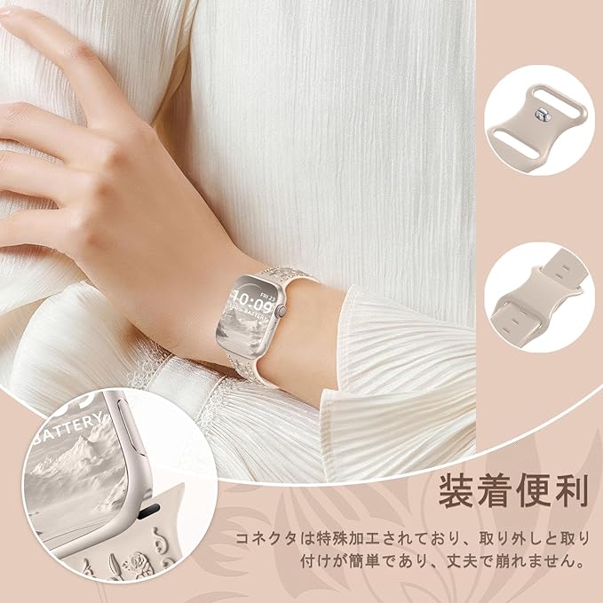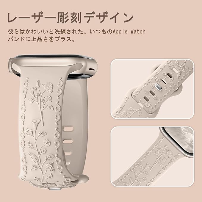 [ 柔らかい素材 ] 特別に設計されている可愛いApple Wacth バンド。Apple Watch バンドは肌に優しい高品質ソフトシリコン素材を採用することで、普通のバンドより更に柔らかく、軽く、安全に着用できます。シリコン素材で装着感が楽で見た目も彫りがあるのでおしゃれです