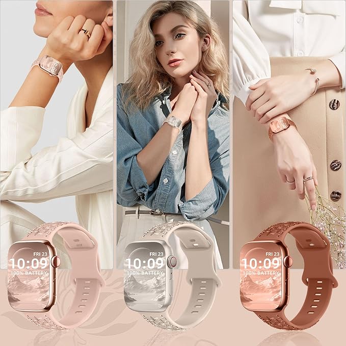 [LanQii] コンパチブル Apple Watch バンド 42mm 41mm 40mm 38mm アップルウォッチ 【3枚セット】 シリコンバンド おしゃれ スポーツ ベルト 可愛 レディース アクセサリー ストラップ Watch Series 11 10 42mm 9 8 7 6 5 4 3 2 1 SE 3 対応 バラ レリーフ 替え 交換ベルト - ピンク&スターライト&ブラウン
