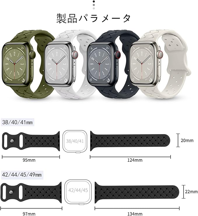 【対応機種】アップルウォッチ11/10/9/8/7/6/SE3/SE2/SE/5/4/3/2/1(42mm/41mm/40mm/38mm)。バンドの表面に数個の調整穴があり、長さが自由に調整可能です。手首サイズは170-220mmの方に適します。購入前に、お手首の周りを測定してください。(Apple Watch本体は付属しておりません、バンドのみです)