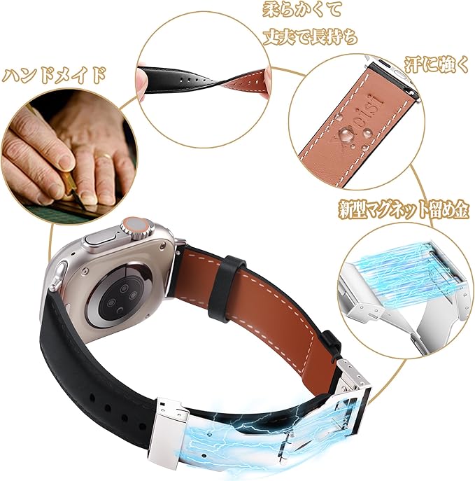 【2025年新モデル:磁気式折りたたみクラスプ設計】この Apple Watch 用レザーバンドの磁気式折りたたみクラスプは 革新的なマグネット式留め具により、片手での素早い閉じ操作と微調整が可能で、あらゆる手首サイズにフィットします。美しさと実用性を兼ね備えた、洗練されたモダンなデザインです。【 1台2役】本製品にはピンバックルを同梱しております。いつでもピンバックルモードに交換することができます。