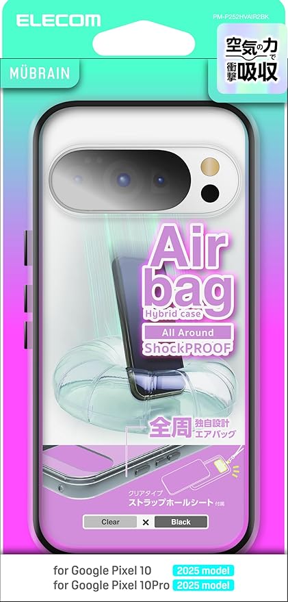 エレコム Google Pixel 10/10 Pro ケース カバー 透明 耐衝撃 衝撃吸収 ハイブリッド TPU ショルダー ストラップシート付 カメラ保護 ワイヤレス充電対応 エアバッグ ブラック PM-P252HVAIR2BK
