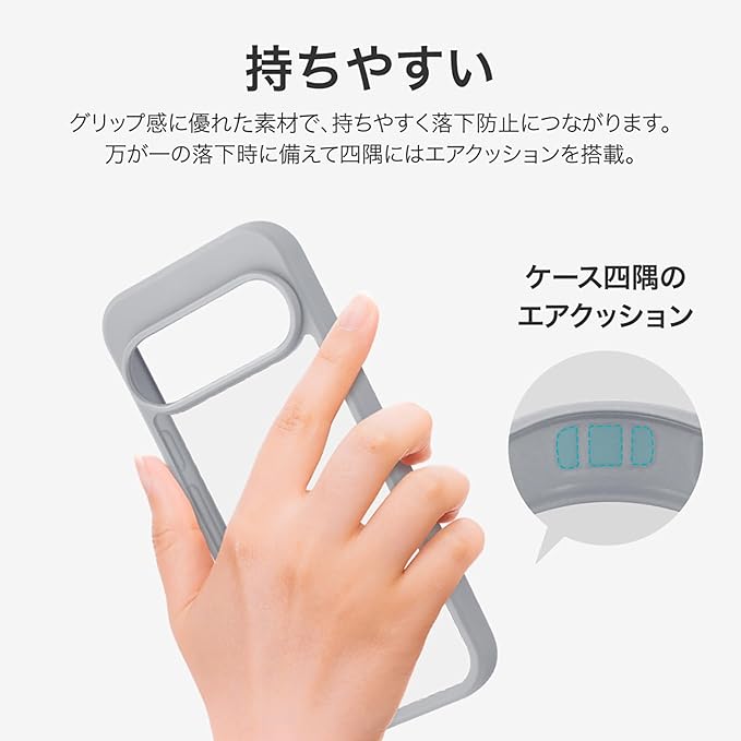 【持ちやすく、使いやすい】側面のTPUはグリップ感に優れ、持ちやすく落下防止に繋がります。万が一の落下時に備え、四隅にはエアクッションを搭載。