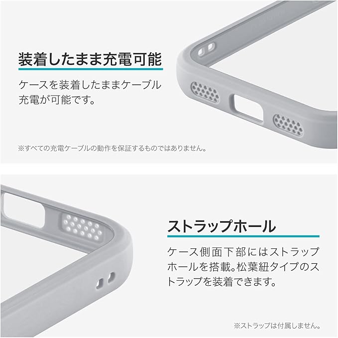 【もっと便利に】ケース側面下部にはストラップホールを搭載。松葉紐タイプのストラップを装着できます。更にケースを装着したままケーブル充電が可能です。※全て充電ケーブルの動作を保証するものではありません。