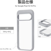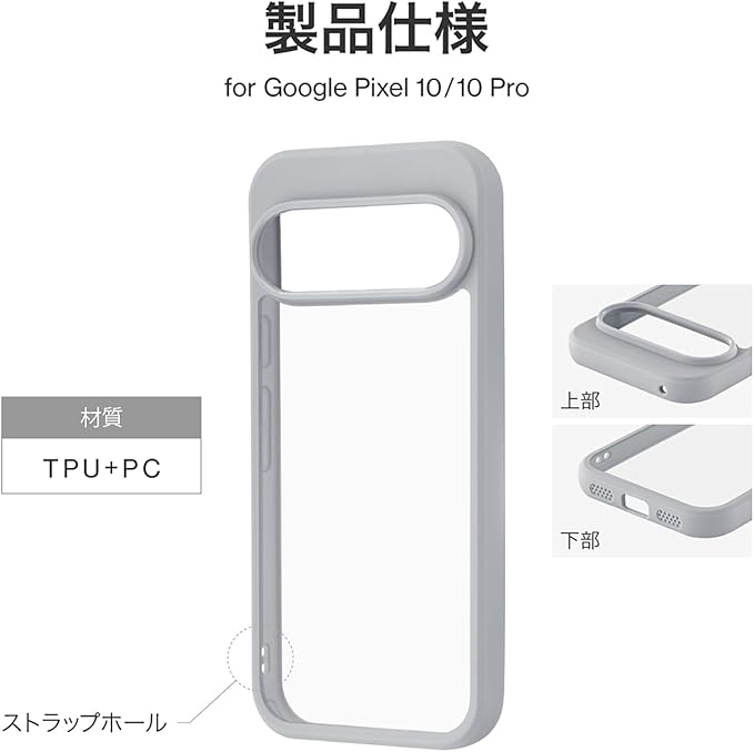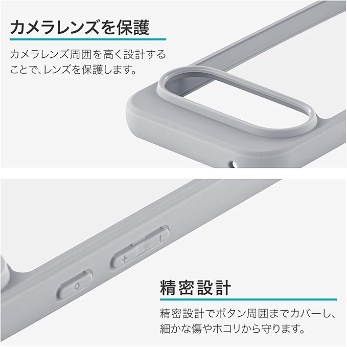 【ハイブリッドケース】硬く透明度の高いPC(ポリカーボネート)と、柔らかく耐衝撃性があるTPUのハイブリッドケースです。2つの素材で端末をしっかり保護します。【耐傷・耐衝撃】ケース背面は硬く透明度の高いPC(ポリカーボネート)です。傷に強く、黄変しにくい素材です。側面は柔軟性があるTPU素材で、四隅にはエアクッションを搭載。落下時に多い角への衝撃に備えます。【持ちやすく、使いやすい】側面のTPUはグリップ感に優れ、持ちやすく落下防止に繋がります。万が一の落下時に備え、四隅にはエアクッションを搭載。【精密設計】カメラレンズ周囲を高く設計することでレンズを保護。ボタン周囲までカバーする精密設計で、細かな傷やホコリから守ります。【もっと便利に】ケース側面下部にはストラップホールを搭載。松葉紐タイプのストラップを装着できます。更にケースを装着したままケーブル充電が可能です。※全て充電ケーブルの動作を保証するものではありません。