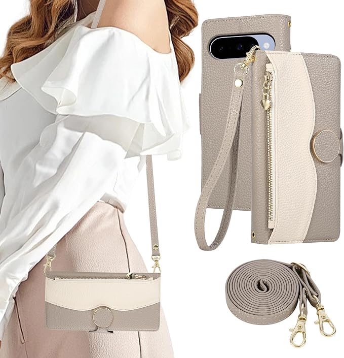 KW-LINK Google Pixel 10/10 pro ケース 手帳型 ショルダー スマホケース グーグルピクセル10 ケース 手帳型 おしゃれ 2色パッチワーク 携帯カバー ピクセル10pro カバー 小銭入れ カード収納 ジップ付き 財布型 ピクセル10 手帳型ケース 肩掛け 斜め掛け ストラップ付き スタンド機能 マグネット式 可愛い 女性 贈り物-グレー