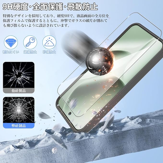 【ガラスフィルム付きの心配りある保護】日本製旭硝子材料を採用し、外部からの沖撃に強く、スマートフォンの画面への沖撃を防ぎます。また、特殊な飛散防止設計により、フィルムが割れても飛散せず、高い安全性を実現しています。スマートフォンを全面的に保護し、液晶画面の安全を守り、長く安心してお使いいただけます。