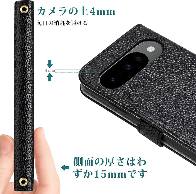 【耐衝撃性】耐熱性と柔軟性を誇るPUレザーから作られていて、滑りにくく、指紋、油分などもつきにくく、手帳型ならではの全面保護機能でディスプレイはもちろん、背面もしっかりガードします。さらにカメラレンズ保護構造でスマホ本体を傷から360度しっかり保護してくれます。