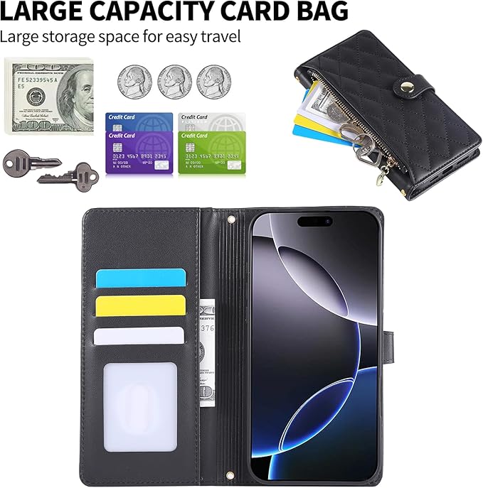 Gedurya Google Pixel 10 Pro XL 用 ケース 手帳型 ショルダー グーグル ピクセル10pro xl ケース ショルダー ファスナー型 小銭入れ 斜めがけ 肩掛け ピクセル10proxl スマホケース 財布型 カード収納 コインポケット Pixel10プロ XL 手帳型 携帯カバー マグネット開閉式 スタンド機能 同色ストラップ付き ロング+ショート - ブラック