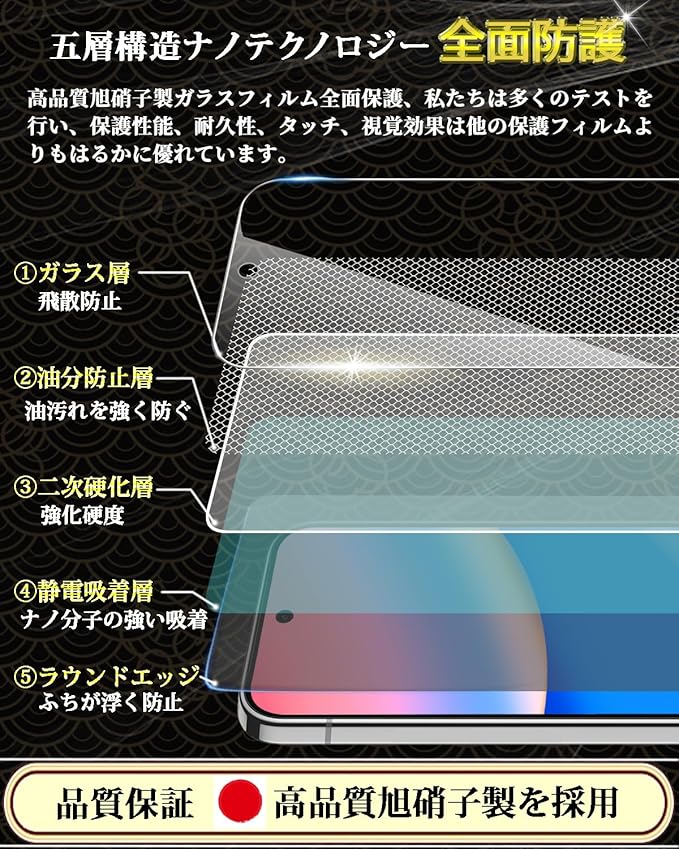 特徴 全面保護,9H表面硬度,飛散防止,防指紋,撥油コーティング,撥水剤,耐衝撃性,ラウンドエッジ,気泡なし,高透過率,簡単貼り付け