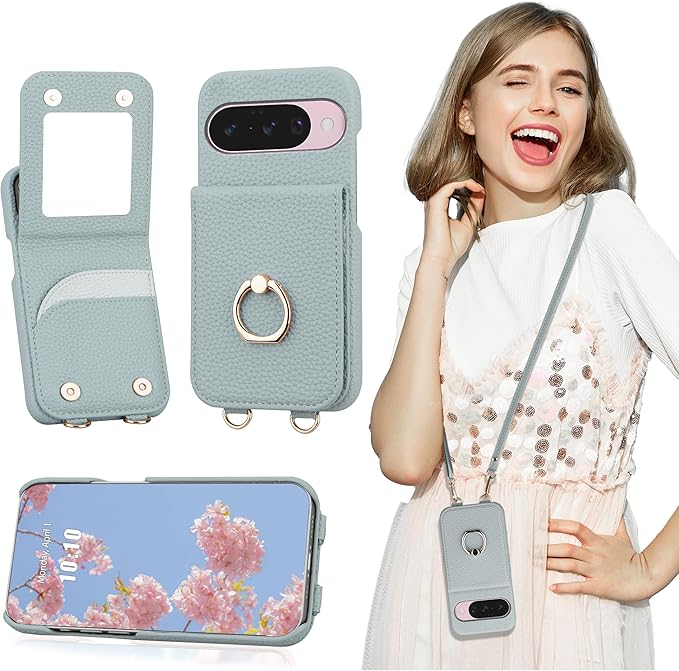 For Google Pixel 10/10 Pro ケース 手帳型 グーグルピクセル10 ケース ショルダー Googleピクセル10 ケース リング付き グーグルピクセル10Pro カバー 肩掛け 斜め掛け(長さ調整可能) 背面カード収納 鏡付き スタンド機能 ミラー付き (オータムブルー)