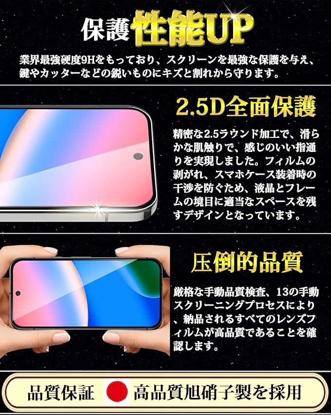 特徴 全面保護,9H表面硬度,飛散防止,防指紋,撥油コーティング,撥水剤,耐衝撃性,ラウンドエッジ,気泡なし,高透過率,簡単貼り付け