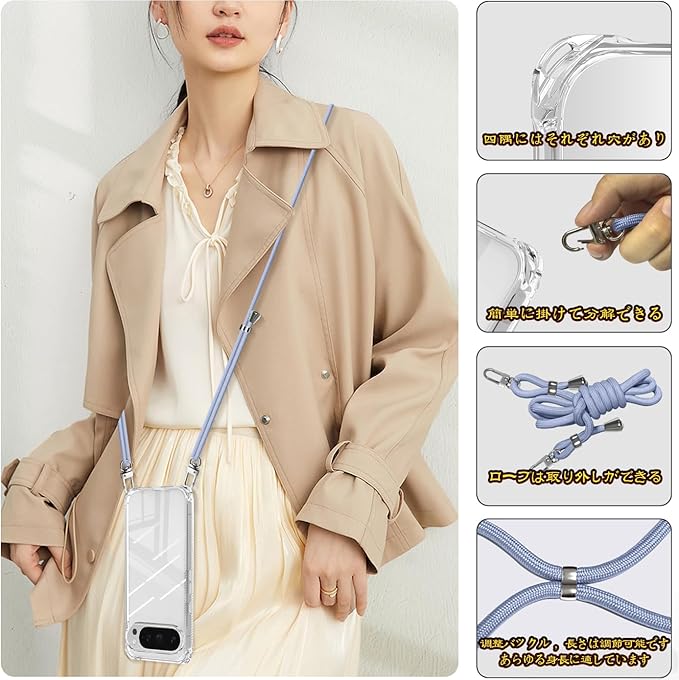 Google Pixel 10/10 Pro 用 ケース クリア ショルダー ピクセル10/10pro スマホケース カバー 肩掛け 斜めかけ 縄掛けケース 耐衝撃 全透明 TPU 薄型 紐付き 斜めがけ 織りストラップ付き ネックストラップ 長さ調整可能 取り外し可能 紛失防止 落下防止 ワイヤレス充電対(クリア)