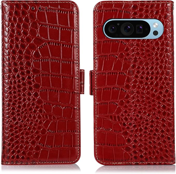 for Google Pixel 9/9 Pro ケース 手帳型 本革 ワニ柄 グーグル ピクセル10 /10プロ 牛革 財布型 鰐柄 クロコダイル柄 耐衝撃 [RFIDブロッキング] カード収納 マグネット式ボタン 横置きスタンド機能 便利 財布型携帯 スマホケース レッド Rureuu