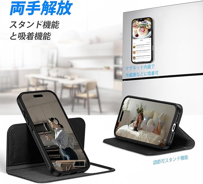 【マグネット付き・スタンド機能】内蔵強力マグネットにより、フタがピタッと確実に閉まります。背面を折り曲げるだけで、ケースがそのままスタンドになります。お好みの角度に調節可能で、手放しでも動画視聴や読書を快適にお楽しみいただけます。