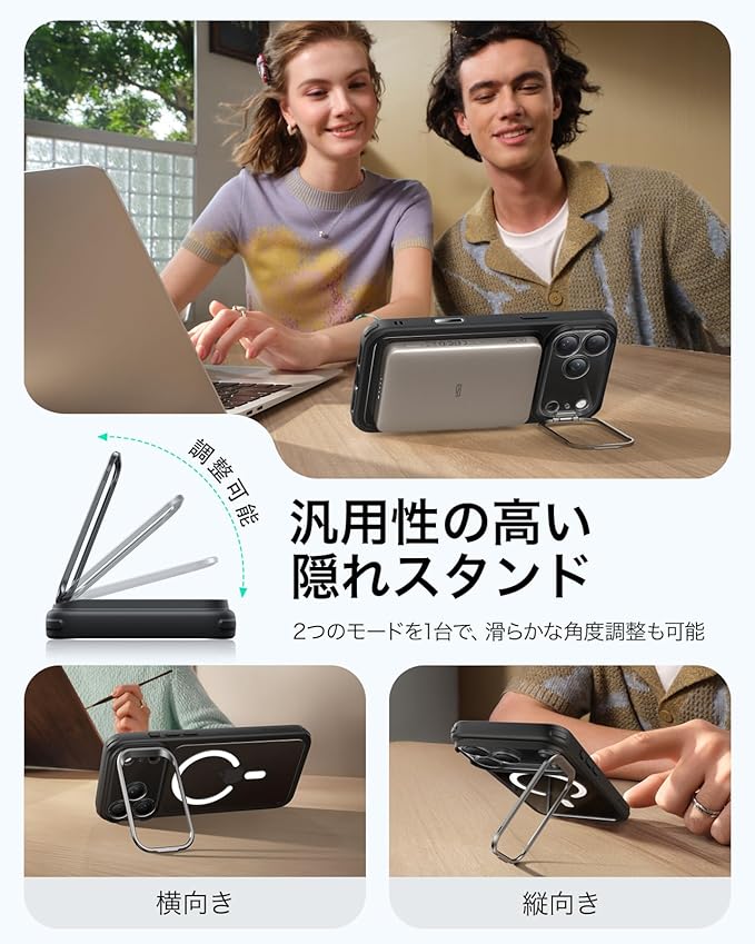 【調節可能なスタンド機能】ESR iPhone 17 Pro カメラを囲いながらMagSafeリングを妨げず、0 ~85 の角度調整が可能で、快適なハンズフリー使用をサポートです。使わないときは折りたたんで隠せますMagSafeリングを100%妨げず、いつでもどこでも自由に調整でき、安定した角度で動画を視聴できます