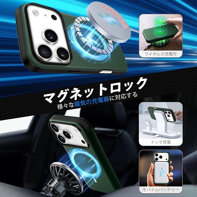 【ワイヤレスと磁気充電可】本商品は薄く加工した本革を使用し、横置きスタンド機能は付いておりませんが、スマホ本体を確実に保護します。軽量かつ薄型設計のため長時間の使用でも熱が蓄積せず、ワイヤレス充電および磁気充電にも対応しております。