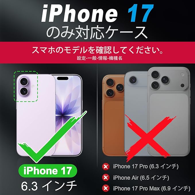 【対応機種・型番確認】iPhone 17(6.3インチ、2025年発売)専用です。その他の機種には互換性がありませんので、ご使用いただけません。ご注文前に、お客様のご利用機種が上記と一致するか必ずご確認ください。万が一、商品到着時に問題があった場合は、ご「注文履歴」画面より出品者へ直接ご連絡ください。
