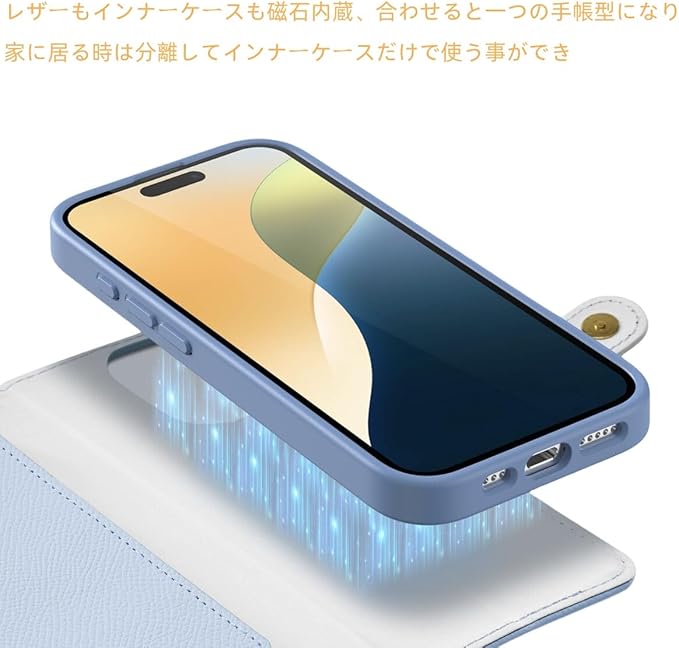 インナーケースMagsafe対応:レザー部分を外すとワイヤレス充電に対応しており、簡単に内蔵の磁力で固定でき、車載ホルダーもスムーズに対応できます。レザーケースにはストラップ付きなので、落下防止対策を施したり、好きなアクセサリーを付けたりすることも可能です。