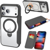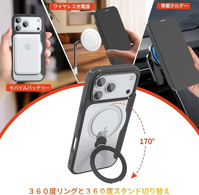 IIKAYO iPhone 17 Pro 用 ケース 手帳型 カード収納 背面クリア MagSafe対応 リング付き 360 回転スタンド 軽い 薄型 耐衝撃 全面保護 縦横両対応 レザー素材 おしゃれ 黒