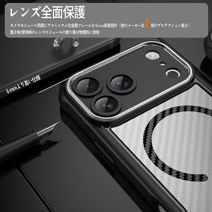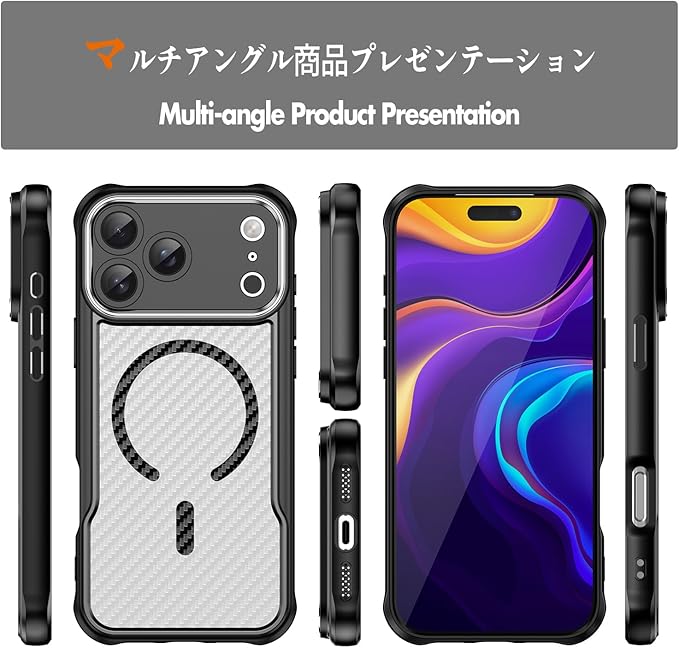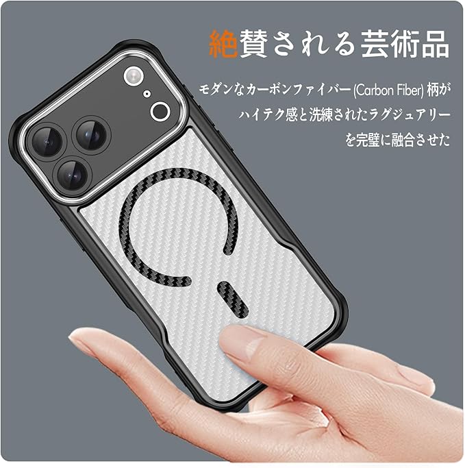 Panda Baby iPhone 17 Pro 用 ケース MagSafe対応 半透明 マット質感 指紋防止 耐衝撃バンパー マグネット搭載 レンズ全面保護 「おしゃれなカーボン調」 (ブラック)