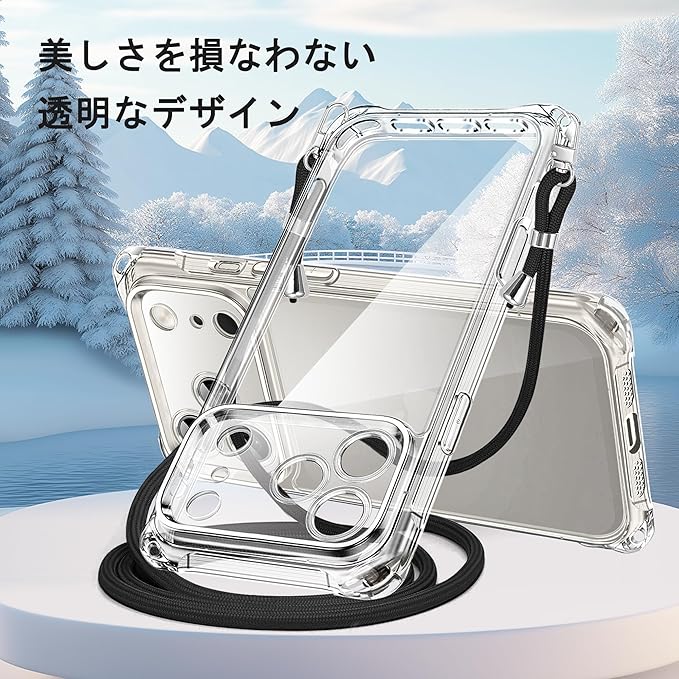 iPhone 17 Pro 用 ケース クリア ショルダー アイフォン17 Pro 用 スマホケース 携帯カバー 肩掛け 斜めかけ 縄掛けケース 透明 耐衝撃 TPU 薄型 軽量 紐付き 織りストラップ付き ネックストラップ 長さ調整可能 取り外し可能 落下防止 ワイヤレス充電対応 (クリア)