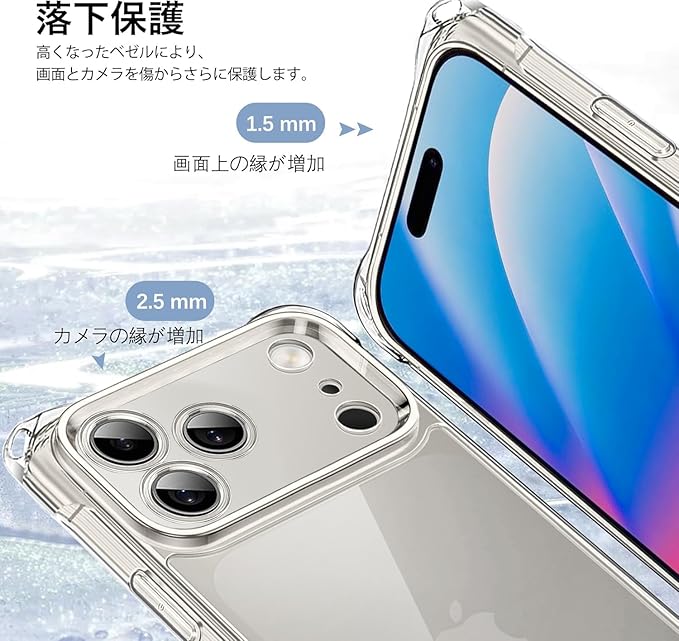 【高耐衝撃性・レンズと液晶を保護】カメラレンズの周りに段差をつけて擦り傷を防ぎます、平らな場所においても、液晶画面とカメラレンズに直接触れることがなく、ケース四隅のエアクッションデザインにより、ケースの四角を強化し、本体が落ちる場合に伝わる衝撃を吸収し、落下時の衝撃を最小限に抑えます、iPhoneを全方位からしっかり守れます。