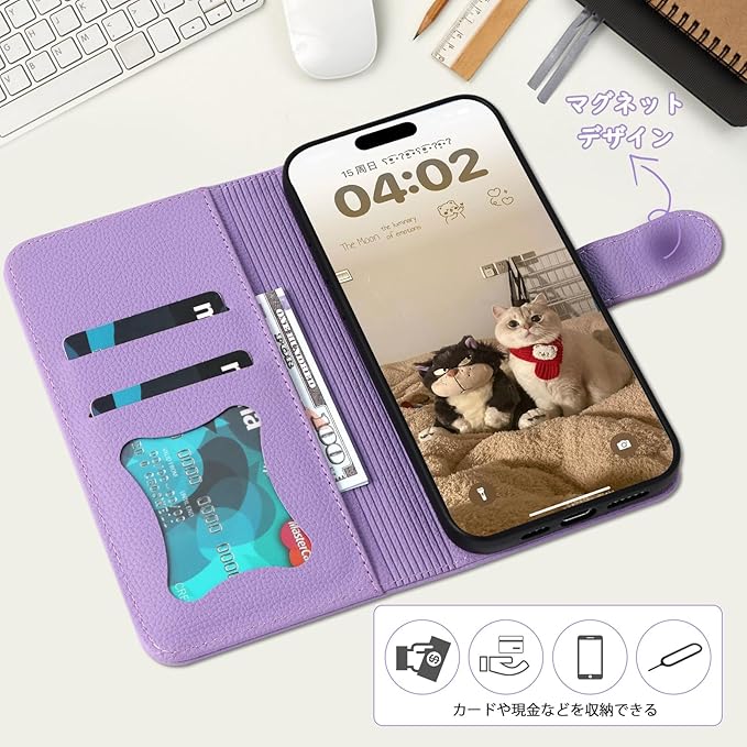 収納機能 2つのカードポケット付きのRosbtibケースには、ICカードや免許証などが収納でき、抜群な収納機能、通勤やお出かけに便利です。近所の買い物や犬の散歩などでは、小銭や紙幣まで入るお財布ポケット収納付きスマホケースがあり、スマホ1台だけで身軽に外出できます。