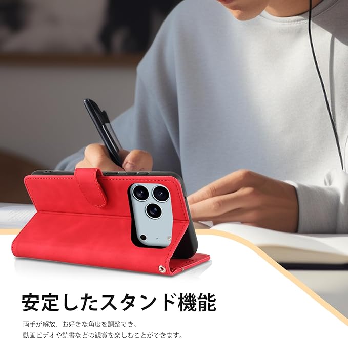 【スタンド機能とカード収納】:いphone17pro ケース 手帳型の横置きスタンド機能が付いて、横向いて斜めに立てて、お好きな角度を調整でき、両手が解放され、お気軽に読書やビデオの観賞を楽しむことができます。iPhone17 Pro 財布型ケースとして、内側に3つカードポケット、車券と名刺などに便利なカードスロット、小銭など挿入可能サイドポケット、ちょっとしたお出かけにもこれ一つでOK!