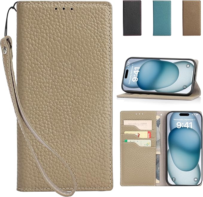 CLICSUN iPhone17Pro 用の ケース 高級牛本革ケース 手帳型 アイフォン17 Pro 用の カバー 本革 レザー いPhone 17 Pro カバー スタンド機能 ストラップ付き マグネット式 カードポケット グレー