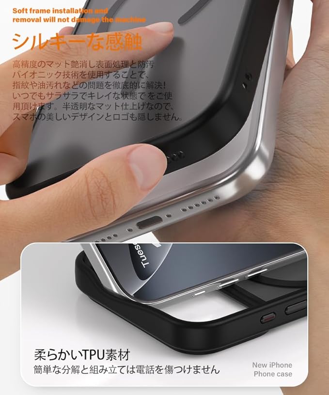 【半透明・マットな質感】高精度のマット艶消し表面処理また防汚バイオニック技術を使用 したことで。指紋や油汚れなどの問題を徹底的に解決! 特に、背面はマット加工、高級感と神秘感があります。背面のポリカーボネートは、耐久性や耐摩耗性に優れ、マットな質感でサラサラして触り心地がすごく良いです。
