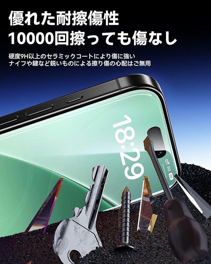 「9H硬度超え・スクラッチ防止・飛散防止」本製品はアメリカ製ゴリラガラス(Corning)を採用しており、MIL-STD-810H軍用規格テストをクリア済、硬さは9Hを超えます。鞄やポケットのなかで、鍵などの鋭いものにぶつかっても傷が付きにくいです。予期せぬ衝撃からアイフォン17promaxの画面を最大限に保護します。飛散防止加工により、万が一割れてもガラス破片が飛び散ることなく安心して使えます。