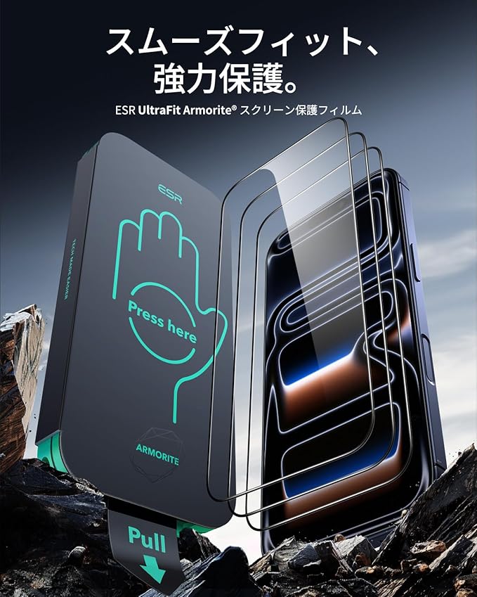 【超強力保護】ESR いPhone17Pro 保護フィルムの超耐久強化ガラスは最大約50kgの圧力に耐え、落下や衝撃、キズから画面をしっかり保護します