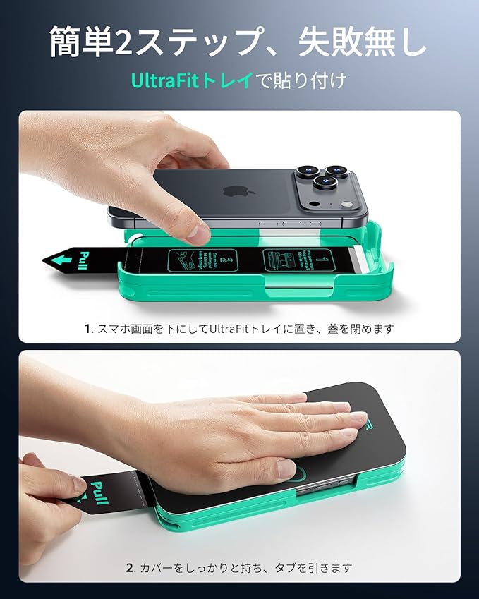 【素早く正確な装着が可能なUltraFit】ESR iPhone 17 Pro スクリーン保護フィルム用のクリーニングキットと、2ステップで貼り付けが行える専用貼り付けツール【UltraFitトレイ】が付属(使用前に説明書を必ずご確認ください)しています。誰でも気泡ゼロで簡単に装着できます