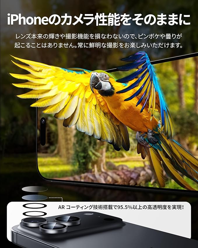 「一体感抜群・ケースとの併用」精密加工により、透明なアクリルリングとガラスで、レンズに溶け込むような一体感。いphone 17pro/ 17promax用カメラ保護フィルムは、貼り付けてもカメラレンズより0.3mmほどしか高くならないため、カメラレンズそのままで使っているような自然なデザインです。iPhone本体の設計を生かしつつ、洗練された高級感を演出!また、フィルムのサイズを最小限に抑えた設計にしているため、市販されているほとんどのケースと併用できます。お気に入りのケースと一緒にお使いいただけます。
